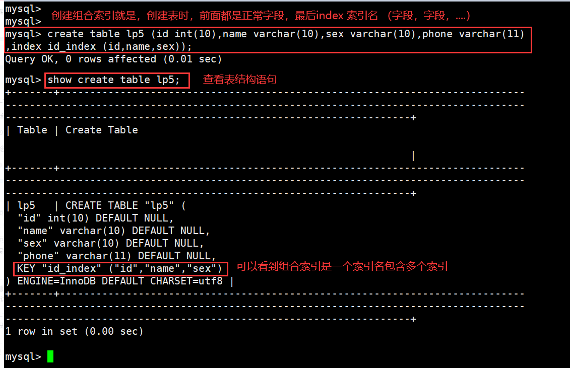 CREATE TABLE 表名 (列名1 数据类型,列名2 数据类型,列名3 数据类型,INDEX 索引名 (列名1,列名2,列名3));select * from 表名 where 列名1='...' AND 列名2='...' AND 列名3='...';