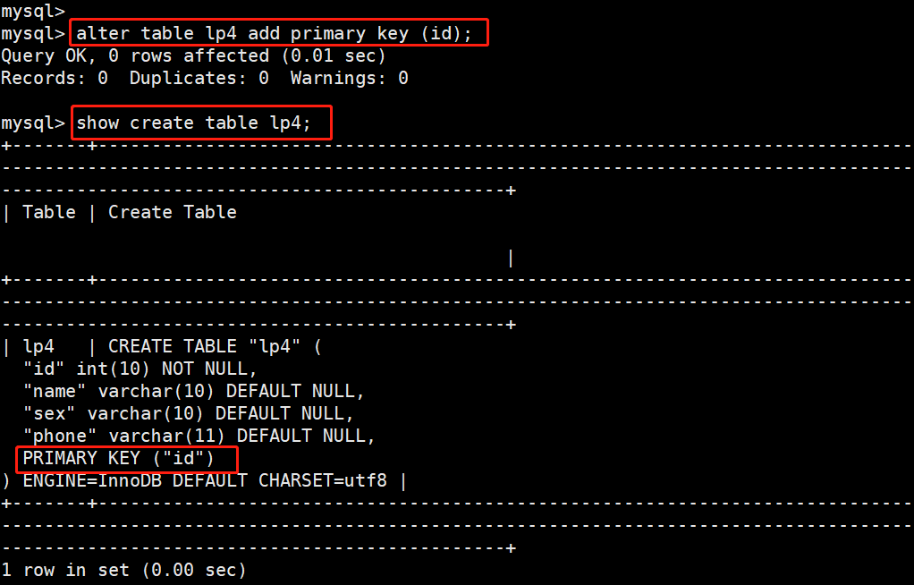 ALTER TABLE 表名 ADD PRIMARY KEY (列名);alter table member add primary key (id);