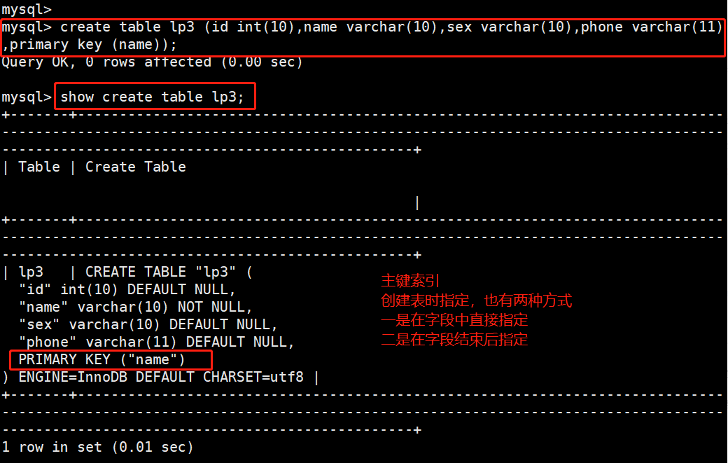 CREATE TABLE 表名 ([...],PRIMARY KEY (列名));