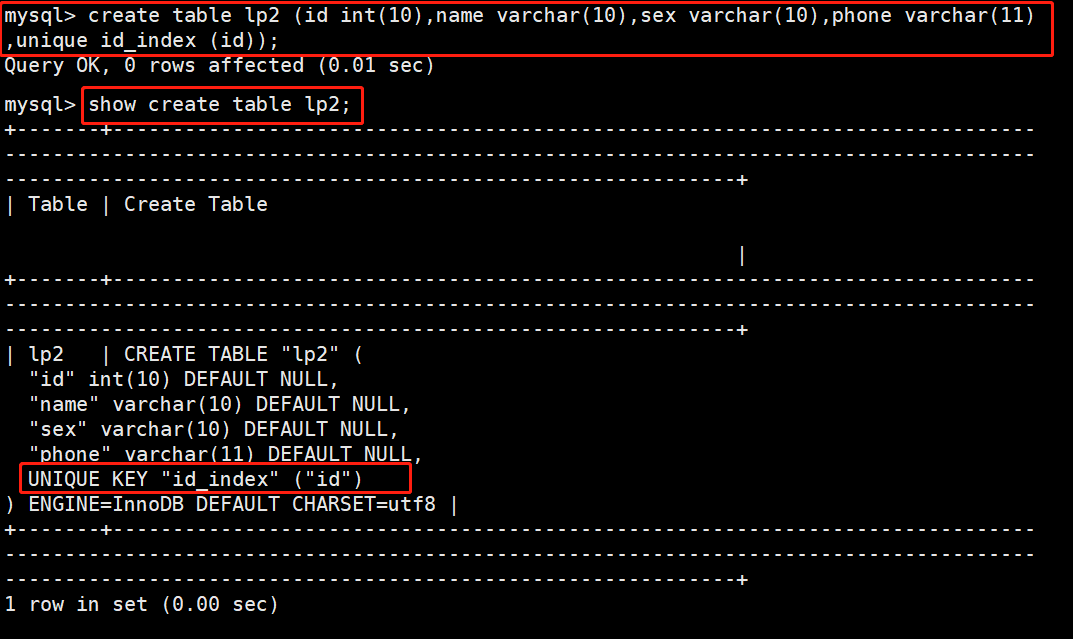 CREATE TABLE 表名 (字段1 数据类型,字段2 数据类型[,... ],UNIQUE 索引名 (列名));