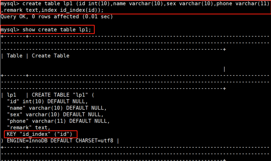 CREATE TABLE 表名 ( 字段1 数据类型,字段2 数据类型[,...],INDEX 索引名 (列名));