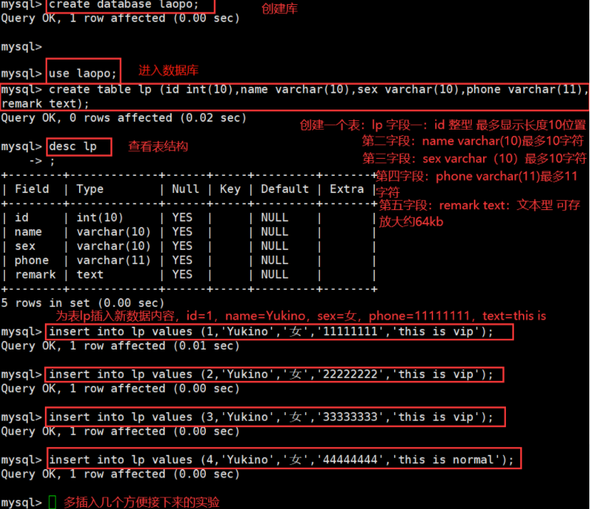 create table member (id int (10) , name varchar (10) , cardid int (18) , phone int (11) , address varchar (50), remark text);