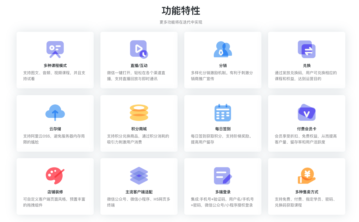 更令人兴奋的是,兔知云课堂教育系统还内置了强大的直播功能。通过简单的步骤,您便能启用视频直播功能,实现与学员的实时互动,提供更丰富的教学体验。此外,系统还拥有助学、教务、营销等多种功能,全方位地支持您日常的运营工作。助学功能让您能够开展多样活动,如打卡、留言和投票,以促进学习氛围。教务功能则提供排课、考勤约课等管理功能,助您智能管理教育机构的日常教务工作。而营销功能下的转介绍拼团、好友助力等活动,则能助力培训机构快速招生。