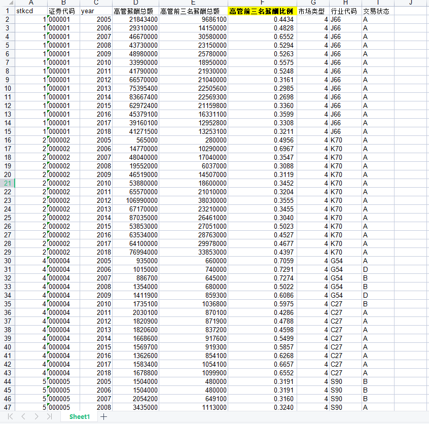 | stkcd | 证券代码 | year | 高管薪酬总额 | 高管前三名薪酬总额 | 高管前三名薪酬比例 | 市场类型 | 行业代码 | 交易状态 |