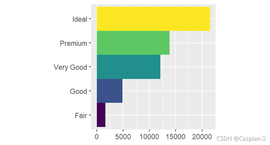 ggplot(diamonds)+geom_bar(aes(x=cut,fill=cut),show.legend=FALSE,width=1)+theme(aspect.ratio=1)+labs(x=NULL,y=NULL)->bar
