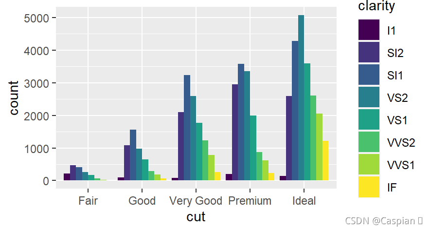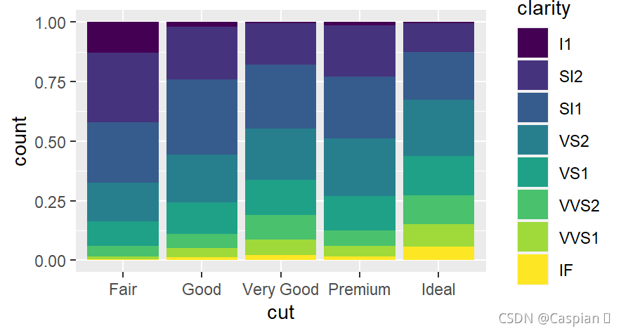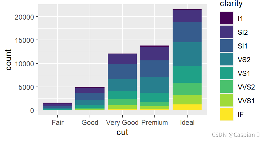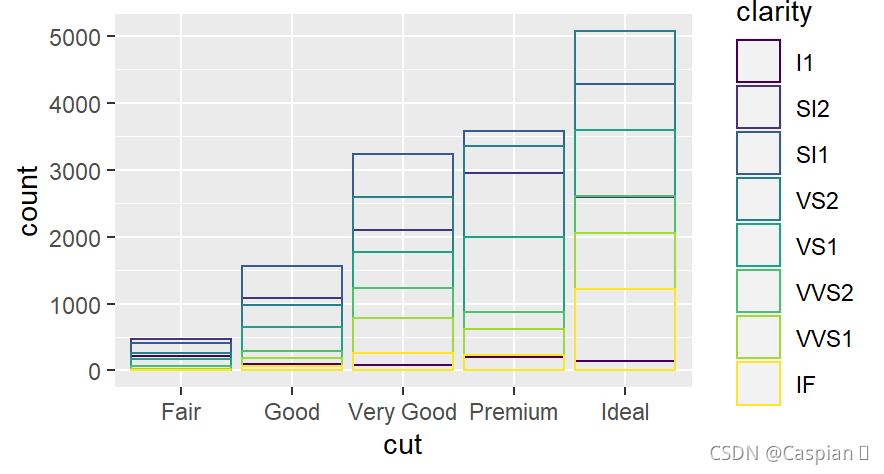 如果将fill映射到另一个变量,条形图会自动分块叠加起来,每个条形表示cut与clarity的另一种组合。