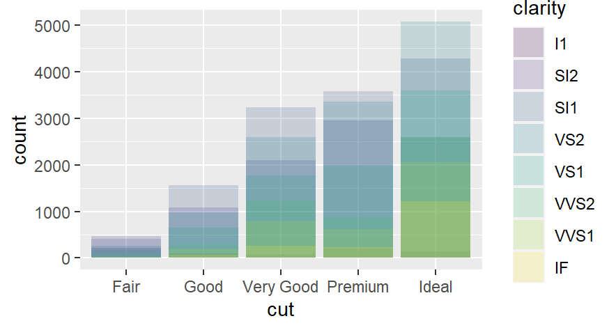 ggplot(diamonds,aes(x=cut,fill=clarity))+geom_bar(alpha=0.2,position='identity')