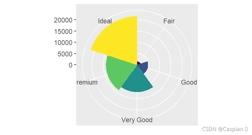 3)coord_polar()使用极坐标。极坐标系可以揭示出条形图和鸡冠花图之间的有趣的联系。