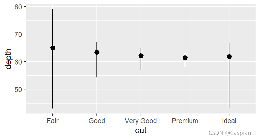 ggplot(data=diamonds)+stat_summary(aes(x=cut,y=depth),fun.min=min,fun.max=max,fun=median)