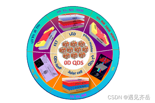 CQDs的光学和电学性质可以通过控制其物理尺寸(大小、形状)来调节,这与传统的通过建立或打破化学键来改变光物理性质的有机分子不同。作为这新一代半导体纳米材料,QDs自身存在如下几个特有的物理学和结构特性:①量子限域效应明显,使QDs具有尺寸、形形状和组成可调的电子和光学特性,使得QDs的发光波长在制定范围内连续可调;②具有良好的光稳定性,激发普宽,发射谱窄;③QDs的生物相容性好,胶体QDs阵列可作为薄膜固体直接集成在不同的电子和光电器件中。由于这些特性,QDs材料在电子器件和光电器件的研究中相继取得了许多重要的结果,如光子-激子转换效率高达700%,量子产率能超过90%,具体的光电应用领域及光电探测器,场效应晶体管,显示器器件,发光二极管和光伏器件等,如图1。