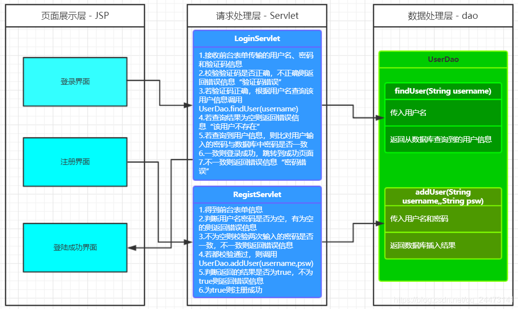 public class RegistServlet extends HttpServlet {private static final long serialVersionUID = 1L;@Overridepublic void doPost(HttpServletRequest request, HttpServletResponse response)throws ServletException, IOException {request.setCharacterEncoding("utf-8");response.setContentType("text/html;charset=utf-8");String username = request.getParameter("username");String password = request.getParameter("password");String rpsw = request.getParameter("rpsw");if(username==null||username.trim().isEmpty()){request.setAttribute("registError", "用户名不能为空");request.getRequestDispatcher("/regist.jsp").forward(request, response);return;}if(password==null||password.trim().isEmpty()){request.setAttribute("registError", "密码不能为空");request.getRequestDispatcher("/regist.jsp").forward(request, response);return;}if(!password.equals(rpsw)){request.setAttribute("registError", "密码不一致");request.getRequestDispatcher("/regist.jsp").forward(request, response);return;}UserDao u = new UserDao();boolean res = u.addUser(username,password);if(res){response.sendRedirect("index.jsp");}else {request.setAttribute("registError", "注册失败,该用户名已存在");request.getRequestDispatcher("/regist.jsp").forward(request, response);}}@Overrideprotected void doGet(HttpServletRequest request, HttpServletResponse response) throws ServletException, IOException {doPost(request, response);}