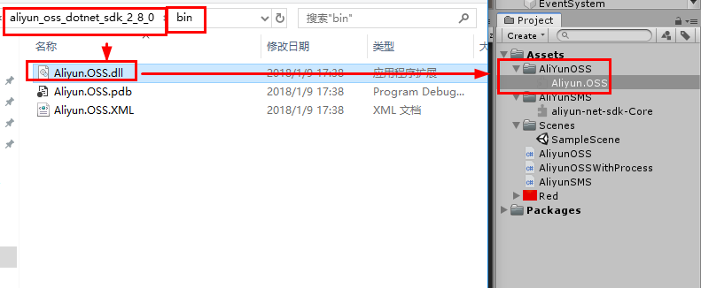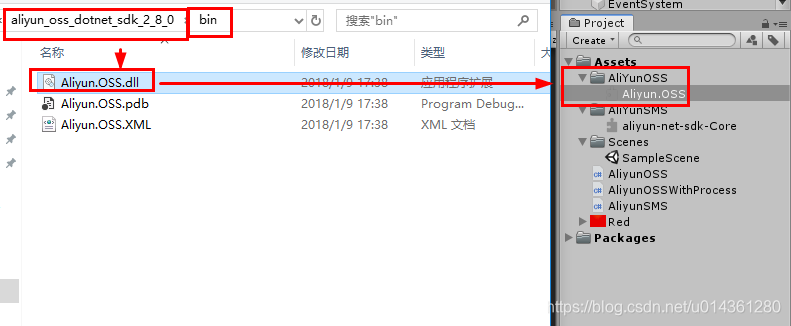 5、下载SDK,解压SDK包,然后 把 Aliyun.OSS.dll 引入Unity