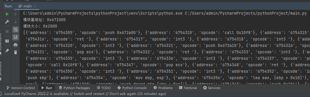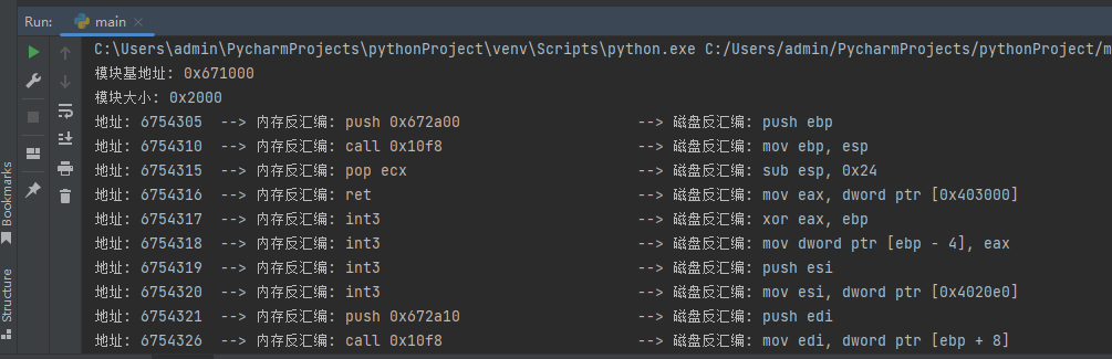 def get_memory_disassembly(address,offset,len):# 反汇编列表dasm_memory_dict = []# 内存列表ref_memory_list = bytearray()# 读取数据for index in range(offset,len):char = dbg.read_memory_byte(address + index)ref_memory_list.append(char)# 执行反汇编md = Cs(CS_ARCH_X86,CS_MODE_32)for item in md.disasm(ref_memory_list,0x1):addr = int(pe_base) + item.addressdasm_memory_dict.append({"address": str(addr), "opcode": item.mnemonic + " " + item.op_str})return dasm_memory_dictif __name__ == "__main__":dbg = MyDebug()dbg.connect()pe_base = dbg.get_local_base()pe_size = dbg.get_local_size()print("模块基地址: {}".format(hex(pe_base)))print("模块大小: {}".format(hex(pe_size)))# 得到内存反汇编代码dasm_memory_list = get_memory_disassembly(pe_base,0,pe_size)print(dasm_memory_list)dbg.close() 上述代码运行后,我们可以得到内存中.text代码段内所有的反汇编指令集及其它的地址信息,如下图所示;