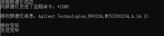 byte[] result = new byte[1024]; //定义接收的字节Socket clientSocket;//初始化频谱仪端口连接IPAddress ip = IPAddress.Parse("192.168.0.250");clientSocket = new Socket(AddressFamily.InterNetwork, SocketType.Stream, ProtocolType.Tcp);try{clientSocket.Connect(new IPEndPoint(ip, 5025));Console.WriteLine("连接频谱仪成功");}catch{Console.WriteLine("连接频谱仪失败,请按Enter键退出");return;}//通过clientSocket接收数据try{Thread.Sleep(1000);string sendMessage = "*IDN?\n"; //这里记得要有换行符哦clientSocket.Send(Encoding.ASCII.GetBytes(sendMessage));Console.WriteLine("向频谱仪发送了远程命令:{0}", sendMessage);//通过clientSocket接收数据int receiveLength = clientSocket.Receive(result);Console.WriteLine("接收频谱仪消息:{0}", Encoding.ASCII.GetString(result, 0, receiveLength));Console.WriteLine("接收完毕");}catch{clientSocket.Shutdown(SocketShutdown.Both);clientSocket.Close();}Console.WriteLine("发送完毕");