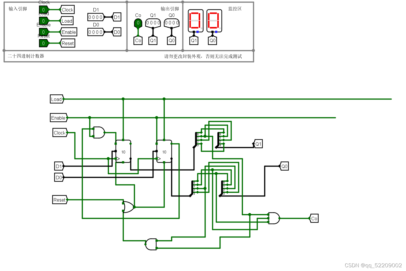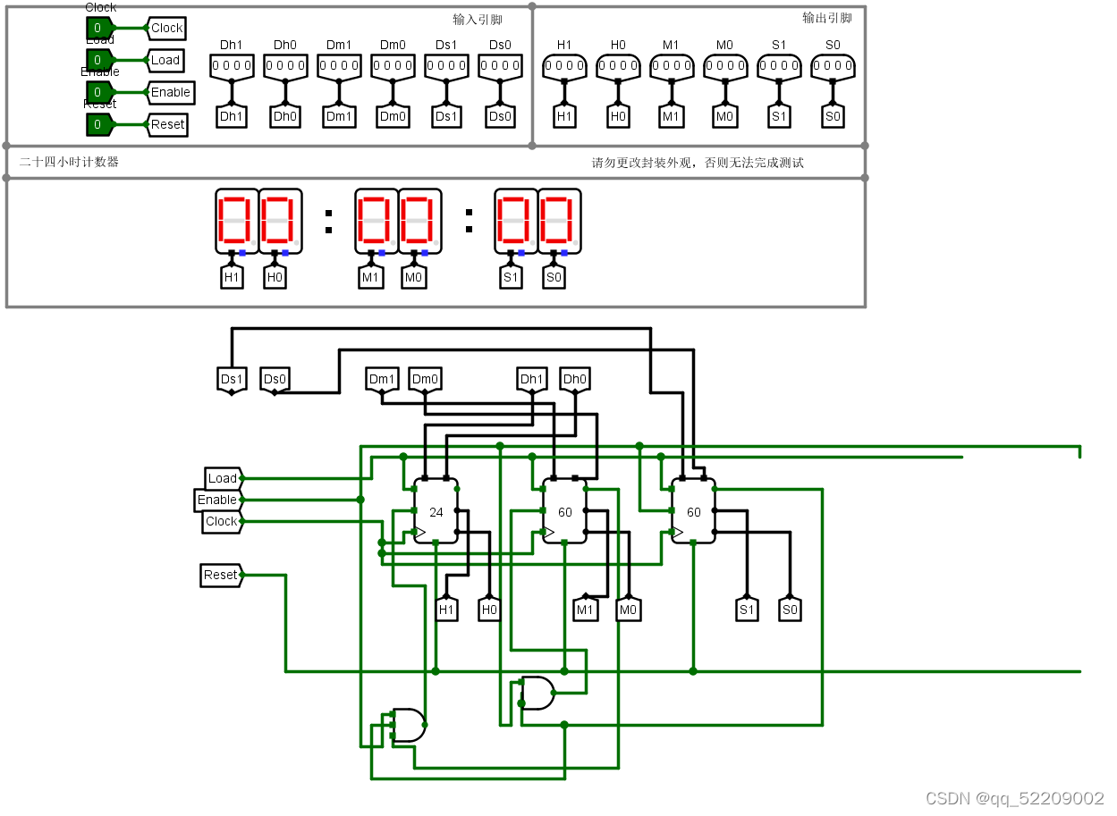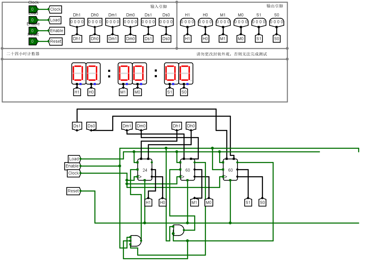 本关任务:利用前面关卡中设计的60进制计数器和24进制计数器,来级联构建一个24小时的计时器,要求具有同步置数、异步清零功能。