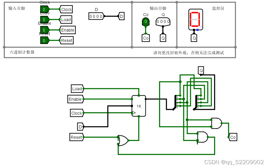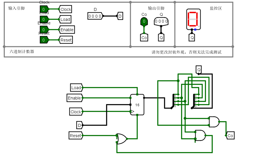 本关任务:在第1关设计的计数器基础上,利用反馈原理设计一个六进制计数器,要求具有同步置数、异步清零功能。