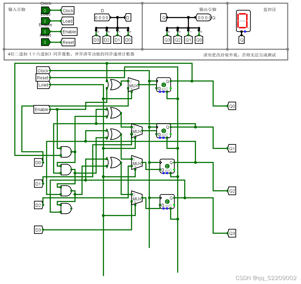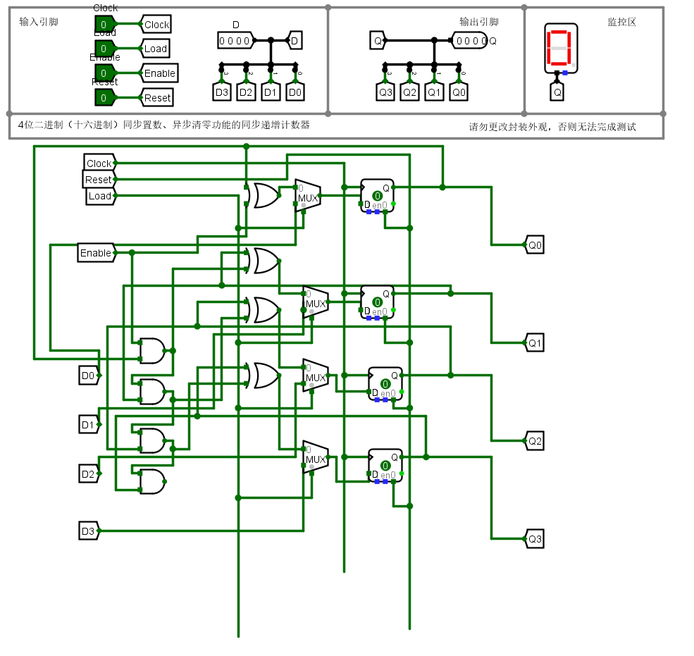 本关任务:设计一个4位二进制(十六进制)同步递增计数器,要求具有同步置数、异步清零功能。