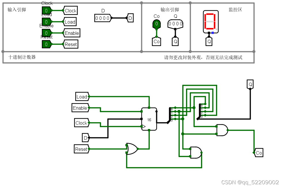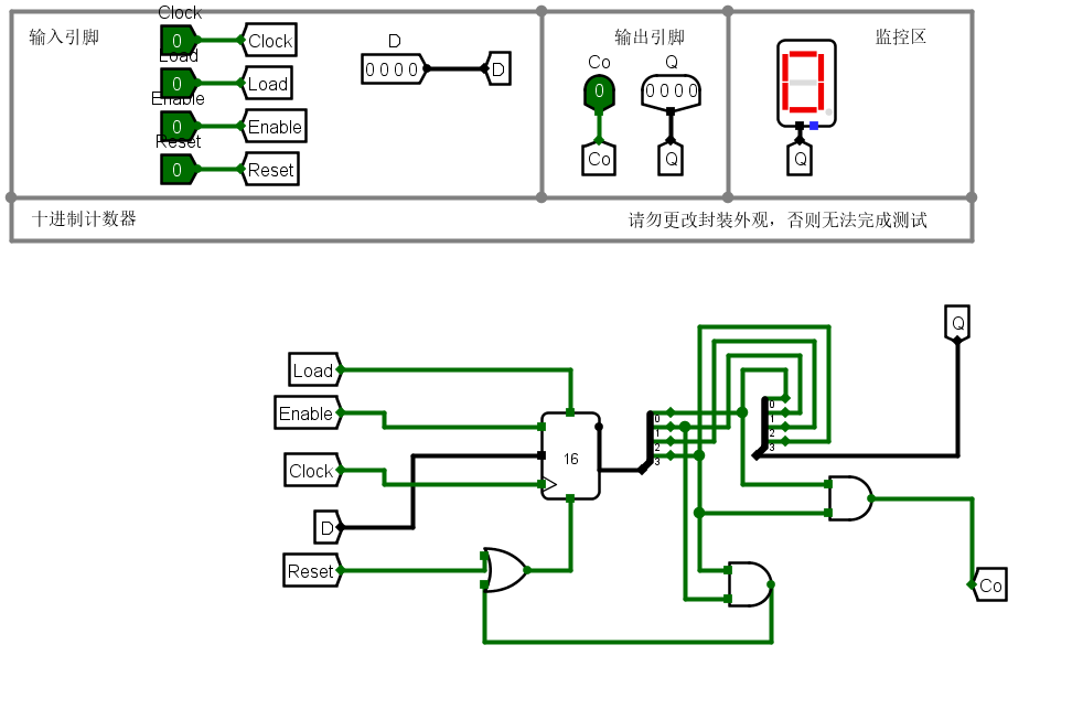 本关任务:在第1关设计的计数器基础上,利用反馈原理设计一个十进制计数器,要求具有同步置数、异步清零功能。