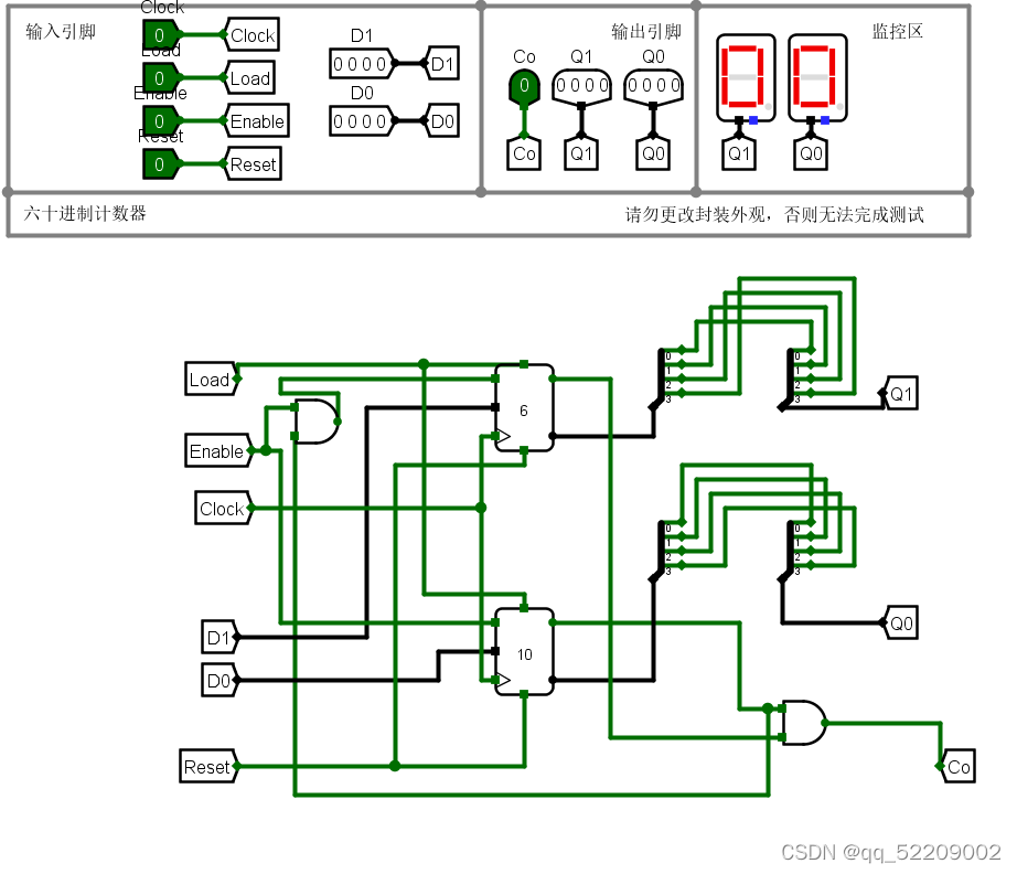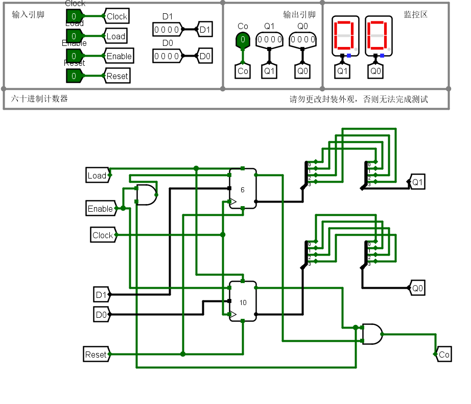 本关任务:在第2关六进制计数器和第3关十进制计数器基础上,用级联的方法构建一个六十进制计数器,要求具有同步置数、异步清零功能。