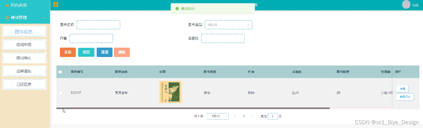 | 图书1 | A | 罗贯中 | 你好 | 添加成功 |
