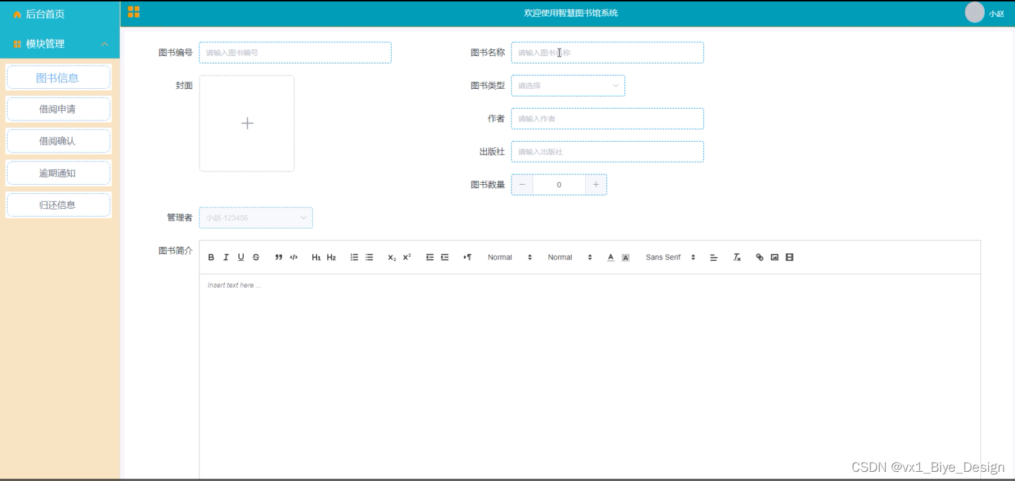 管理者在图书信息列表发布图书,跳转至图书新增表单,提交图书信息,包括图书编号、图书名称、图书类型、作者、出版社、数量、图片简介,新增时间,更新时间、图书封面等,图书提交后,数据库的图书信息表刷新数据,系统将图书信息展示出来。