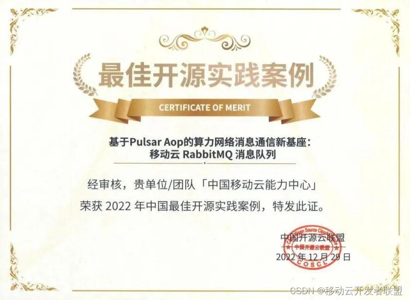 近日,在工业信息化部和软件服务业司指导下,中国开源云联盟开展 2022 年度评选活动。移动云RabbitMQ消息队列,荣膺“2022年最佳开源实践案例”,成功跻身四大年度最佳开源实践案例。