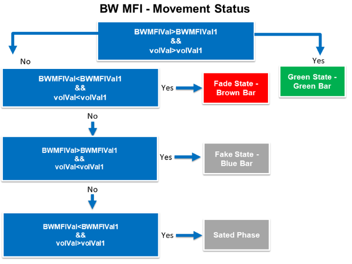 如果当前 BW MFI 大于前一个,并且当前交易量小于前一个。 故此,柱线是蓝色的,它将是假状态的信号。