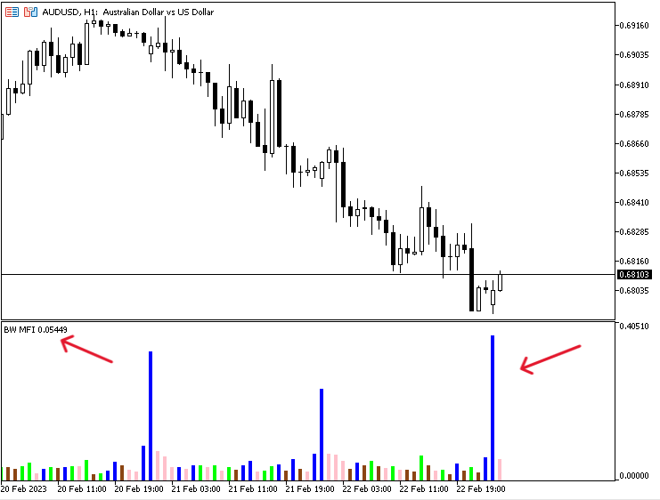 正如您在上一张图片所见,指标出现在图表的子窗口当中。 它以柱线形式显示,基于不同价格和交易量,遵照 BW MFI 指标计算出不同数值和颜色。 指标的每种颜色和数值都表示价格变动的特定状态。