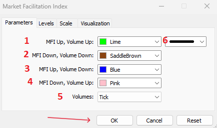 1 — 表示 MFI 的情况和交易量增加的颜色。