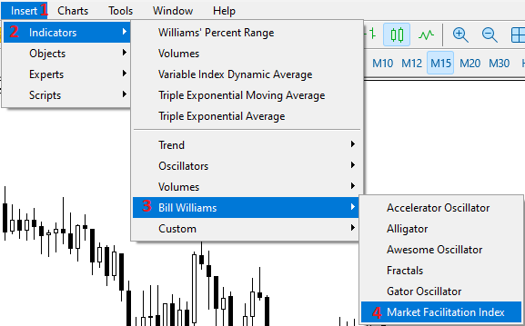 打开 MetaTrader 5 终端,选择插入菜单 ->指标 -> 比尔·威廉姆斯 -> 市场促进指数。 如下图所示:
