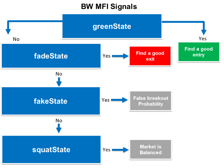 如果当前 BW MFI 大于前一个,并且当前交易量小于前一个。 故此,柱线是蓝色的,它将是假状态的信号。