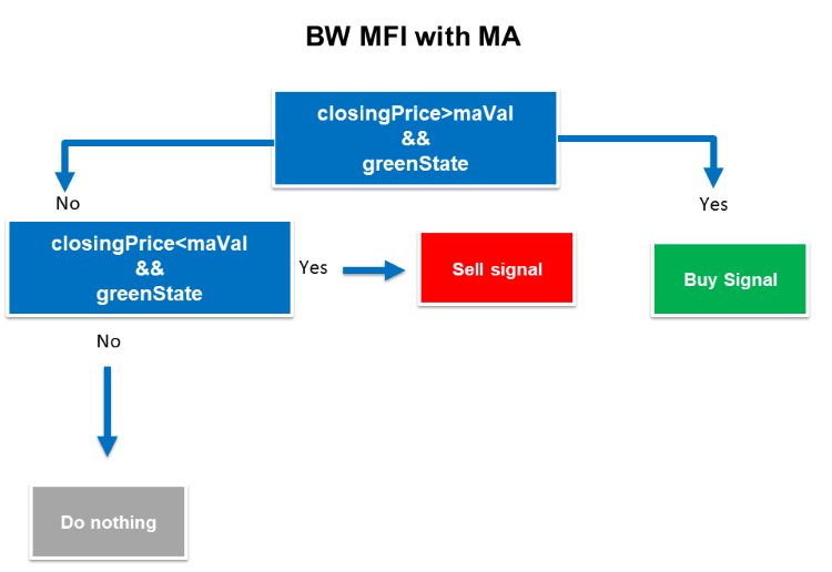 根据此策略,我们需要创建一个交易系统,可根据 BW MFI 指标和简单移动平均线返回买入或卖出信号。 我们需要交易系统从每次跳价识别出四种状态后,持续检查收盘价、当期简单移动平均线和当期 BW MFI 指标的状态。 如果交易系统发现收盘价大于简单移动平均线的当期值,同时当期 BW MFI 状态为绿色,我们需要交易系统返回买入信号作为图表上的注释。 如果它发现收盘价小于当期简单移动平均线,同时当期 BW MFI 状态为绿色,我们需要交易系统返回卖出信号作为图表上的注释。 如果还有其它东西,我们则不需要交易系统返回任何内容。