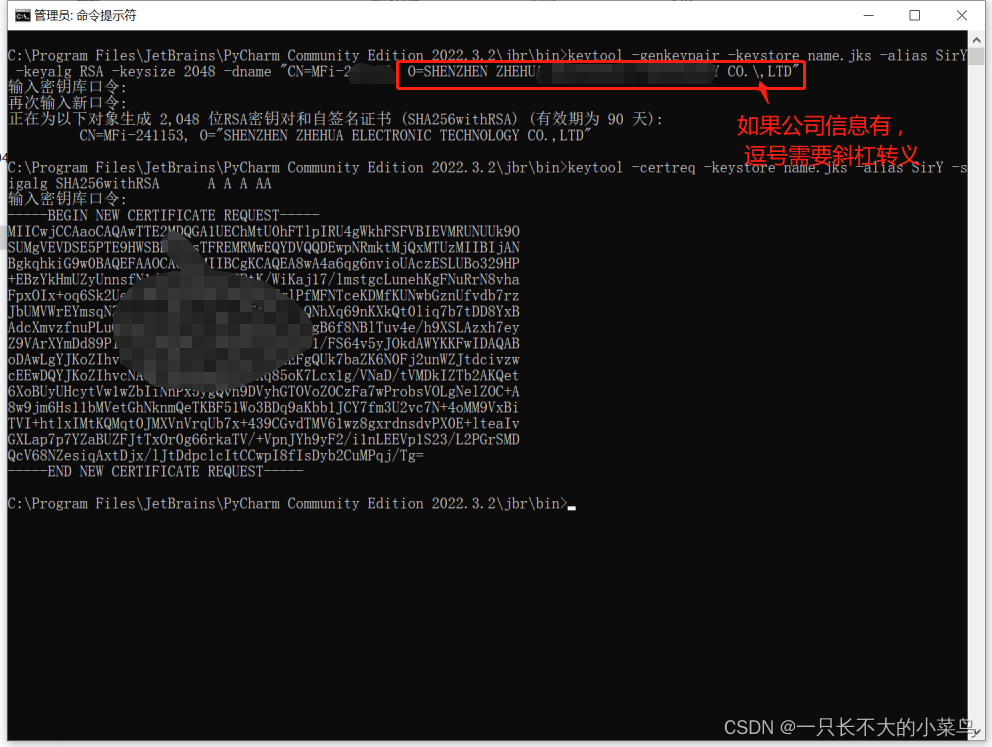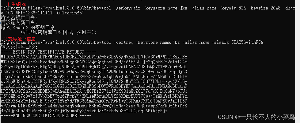 //用于提取证书信息 keytool -certreq -keystore name.jks -alias <你的别名,就是和第二步名字一样> -sigalg SHA256withRSA此时步骤已经完成,JKS文件已生成,在哪个目录自己看CMD的路径。