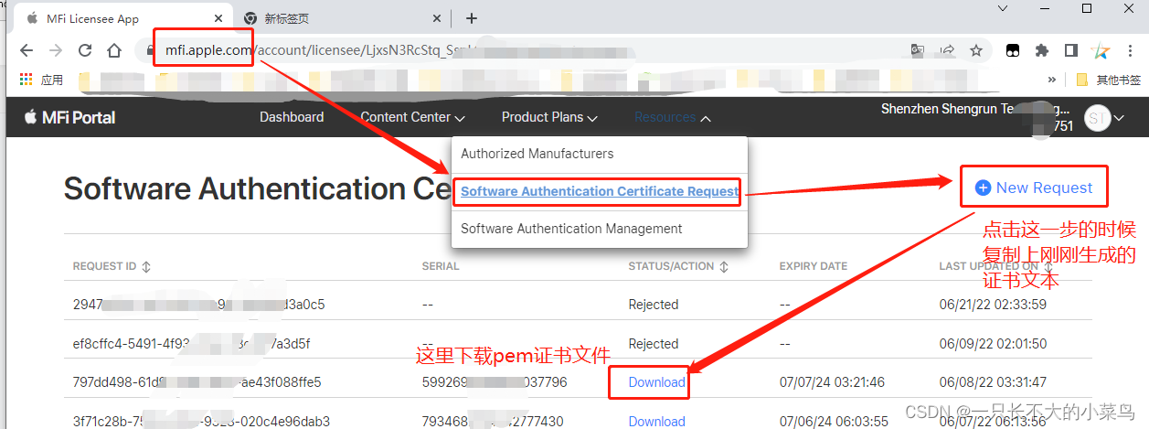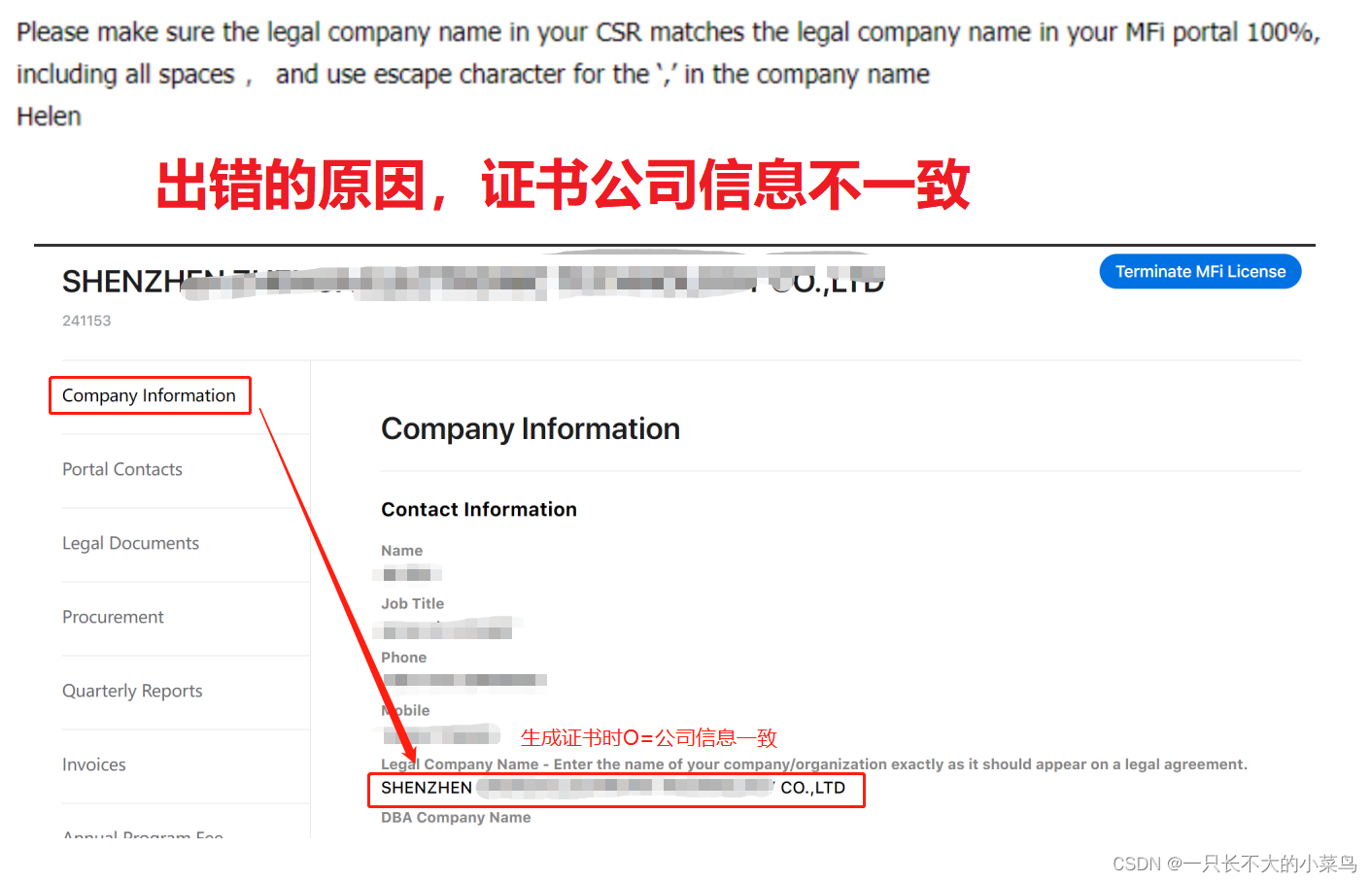 有朋友反馈生成的证书出现报错,或者提交MFI的时候提示信息出错,要确认mfi官网的公司信息和证书一致。