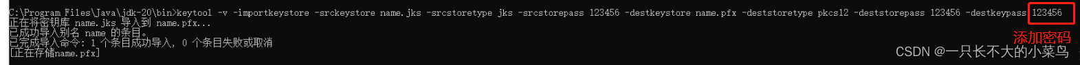 1、先把jks证书转换成pfx格式,证书名称和证书秘钥填你们自己的,那个name文件名,passowrd 是你们自己的秘钥密码
