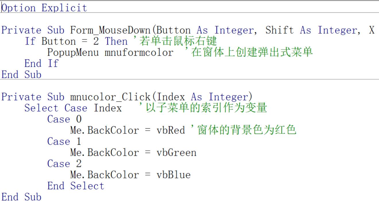 此代码的效果是可以更改窗体的颜色,可以在他的下拉菜单中选择,也可以在弹出菜单中显示菜单的颜色。