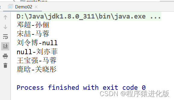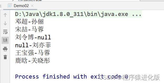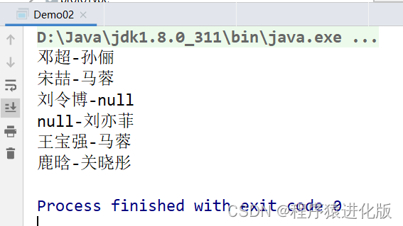 public class Demo02 {public static void main(String[] args) {Map map = new HashMap();map.put("邓超","孙俪");map.put("王宝强","马蓉");map.put("宋喆","马蓉");map.put("刘令博","null");map.put("null","刘亦菲");map.put("鹿晗","关晓彤");Set keyset = map.keySet();Iterator iterator = keyset.iterator();while (iterator.hasNext()) {Object key = iterator.next();System.out.println(key+"-"+map.get(key));}}