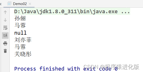 public class Demo02 {public static void main(String[] args) {Map map = new HashMap();map.put("邓超","孙俪");map.put("王宝强","马蓉");map.put("宋喆","马蓉");map.put("刘令博","null");map.put("null","刘亦菲");map.put("鹿晗","关晓彤");Iterator iterator2 = values.iterator();while (iterator2.hasNext()) {Object value = iterator2.next();System.out.println(value);}}