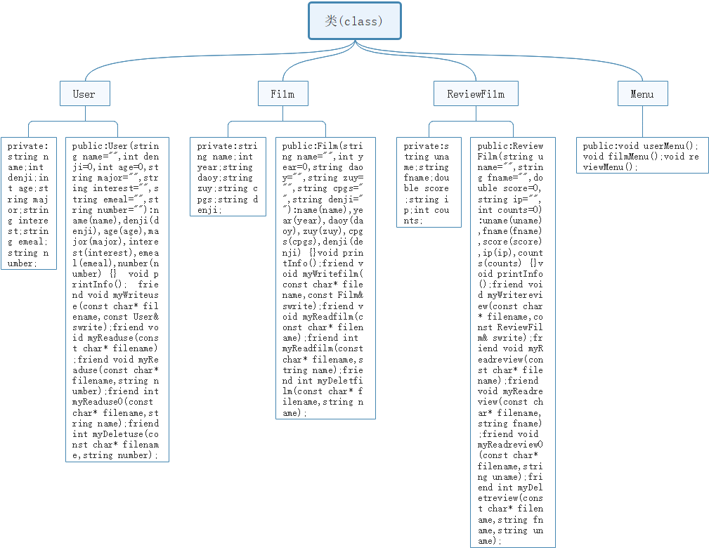 设计三个类:用户类、影片类、影评信息类。用户类用来存储在该网站注册用户的信息,影片类用来存储该网站提供观看的影片信息,影评信息类用来存储用户对影片进行评论和打分的信息。用户类可以包括以下数据成员:用户名、用户等级、年龄组、职业组、兴趣分类、电子邮箱等。影片类可以包括以下数据成员:影片名称、上映年份、导演、主演、出品公司、分级等。影评信息类可以包括以下数据成员:用户名、影片名称、打分、影评链接、评价次数等。(注意:影评信息类的用户名成员可关联到具体的某个用户、影片名称成员可关联到具体的某个影片)