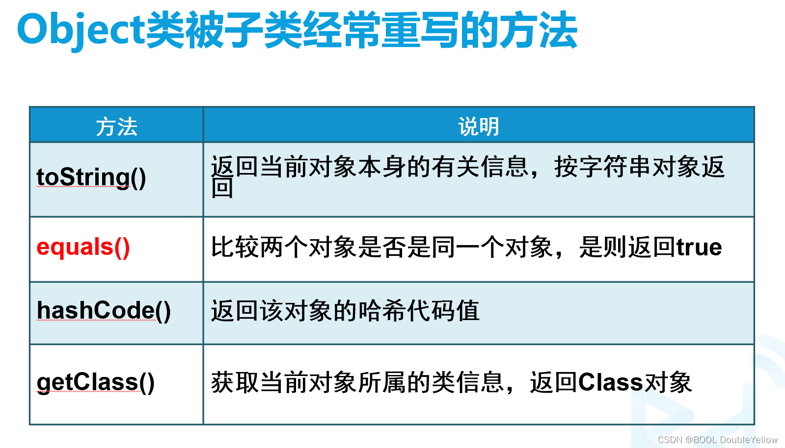 public boolean equals(Student stu) {//调用这个方法的对象(this)和传递过来的对象stu的姓名、年龄相同,就认为两个对象是同一个对 象,返回true,否则返回falseif(this.getName().equals(stu.getName())&&this.getAge()==stu.getAge()){return true;}return false;}