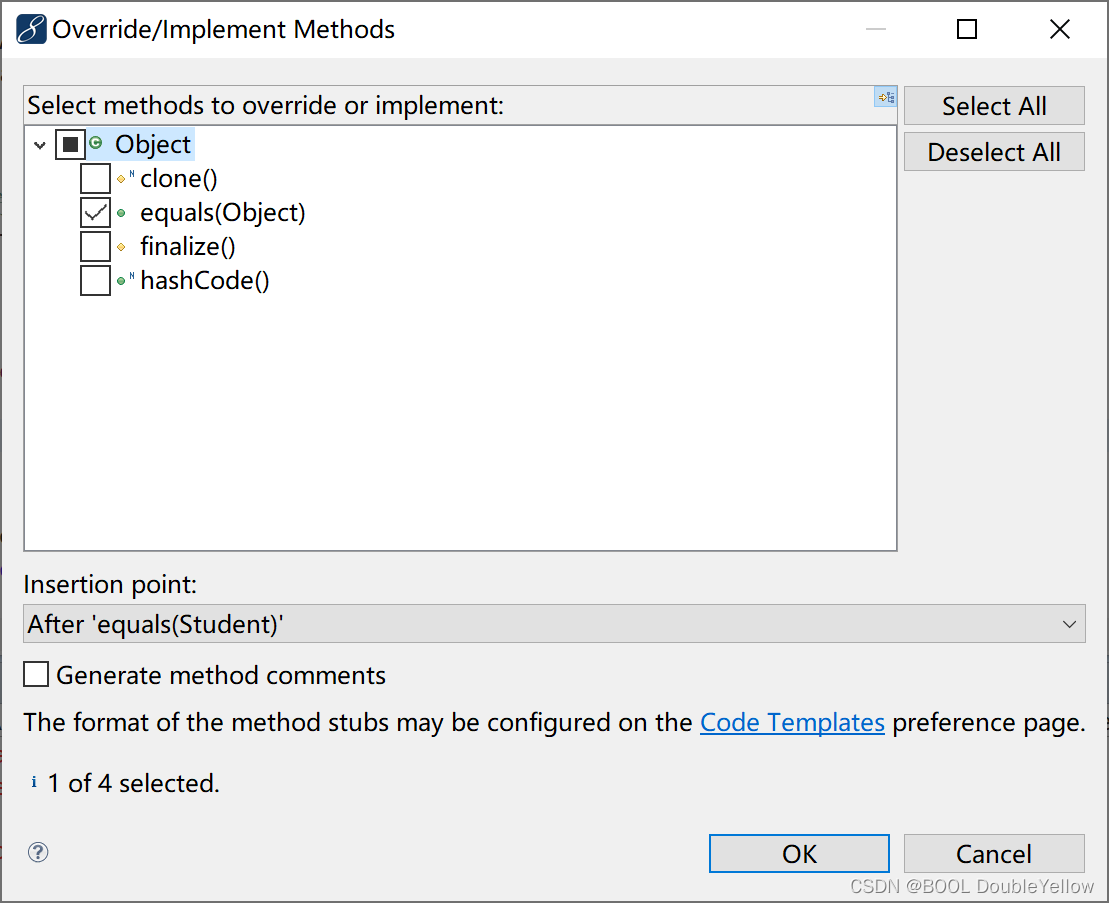 @Overridepublic boolean equals(Object obj) {// TODO Auto-generated method stubreturn super.equals(obj);}