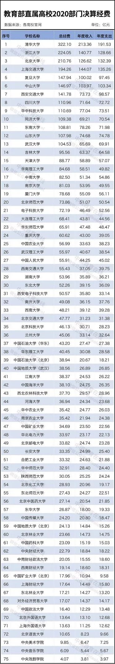 日前,75所教育部直属高校官网均已公布2020年部门决算。据数据显示,共有13所高校总经费过百亿。