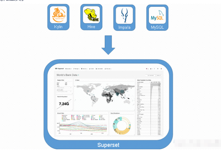 由于Superset能够对接常用的大数据分析工具,如Hive、Kylin、Impala、Druid、mysql等,且支持自定义仪表盘,故可作为数仓的可视化工具。