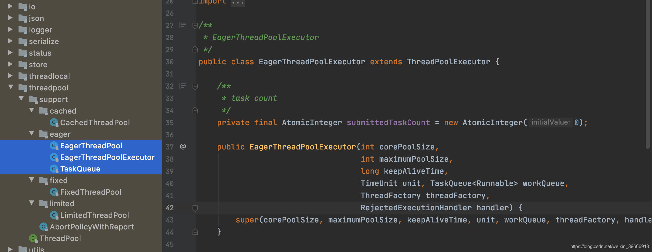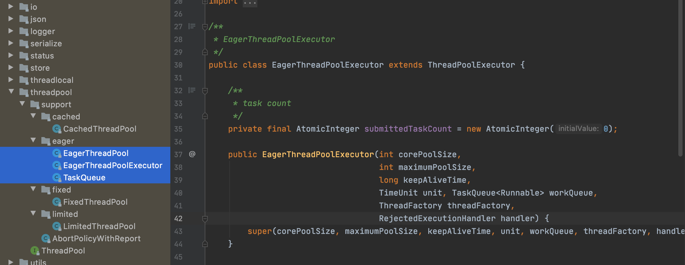 - eager:这个池子的比较不同的是:还是通过ThreadPoolExecutor实现任务的管理,唯一不同的是当任务执行失败的时候,会将任务存储到自定义的taskqueue中。同时维持这一个当前池子的任务的计数。线程池中的所有核心线程都在忙碌时,此时如果再添加新的任务不会放入阻塞队列,而且创建新的线程,直到达到最大线程限制,此时如果还有任务,才会放入阻塞队列。