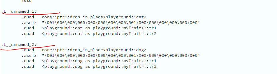 其中的unnamed_1 和unnamed_2,就是两次fun_dyn函数调用前的参数压栈,编译器已经帮忙把vtable准备好了。下面的截图就是。rust/src/librustc_codegen_llvm/meth.rs