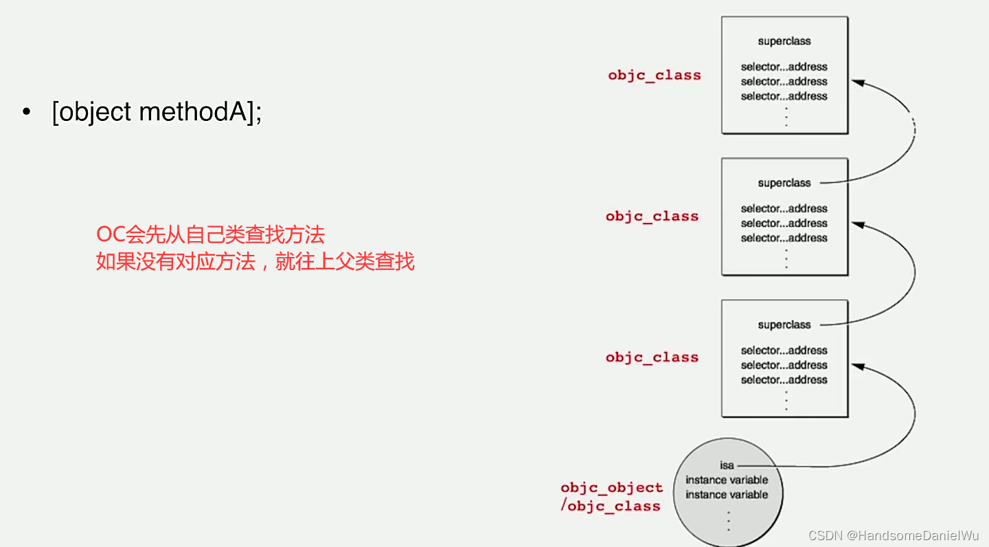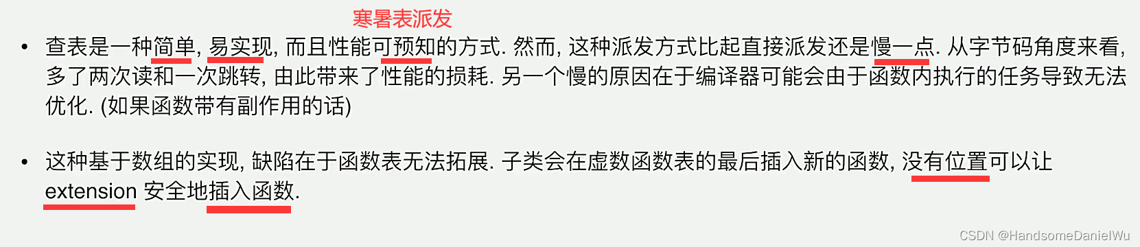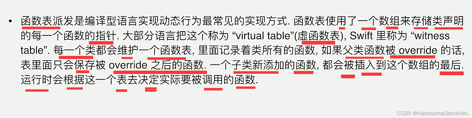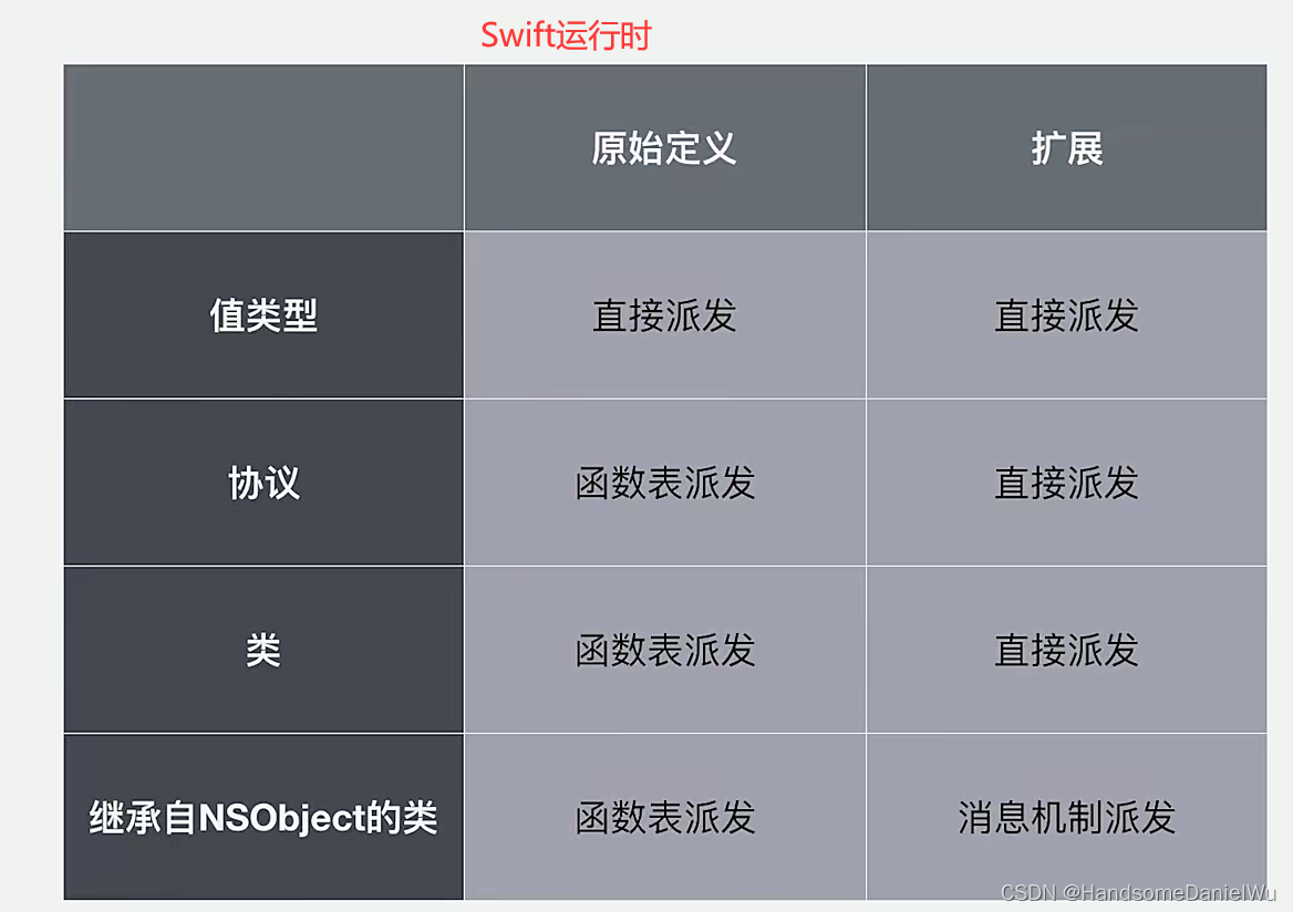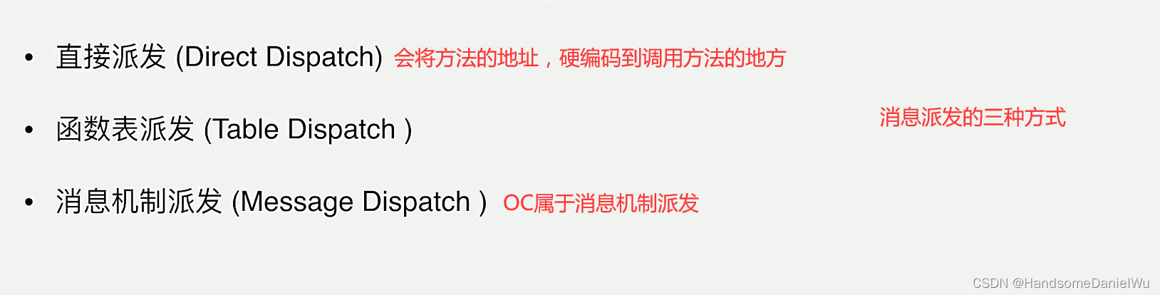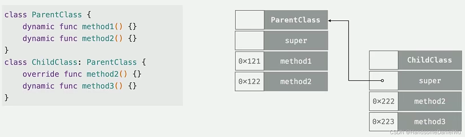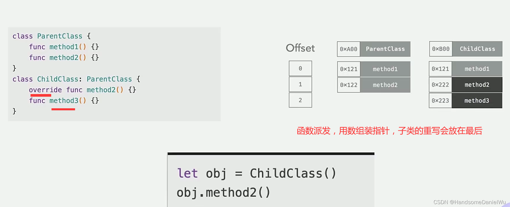 函数表派发,用数组存指令地址,重写父类的放最后面。因为编译时已经确定了调用方法,所以不能用运行时。相对慢