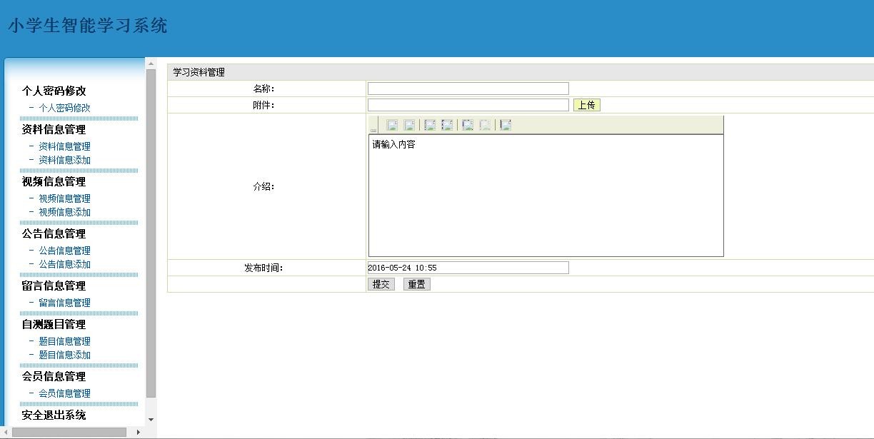 小学生智能学习系统是想给广大同学提供一个便捷的学习途径,让大家能够在有网络的地方进行相对智能的学习,让学习具有主动性,让学生能够合理、有条理的安排自我学习时间。对于教师来说,使得教师能够更加便利,智能化的去管理学生的各项成绩。它可以不受时间地域的限制,随时随地的进行智能化的学习。老师和同学可以在线的进行交流化学习,作业答疑,使得学习更为便捷、快速、方便,还能够很大程度上提升学生的学习兴趣。本系统在设计方面采用了B/S模式,JAVA语言的开发,采用My Eclipse开发平台,使用JSP技术,后台数据库采用SQL SERVER 2008数据库进行开发。