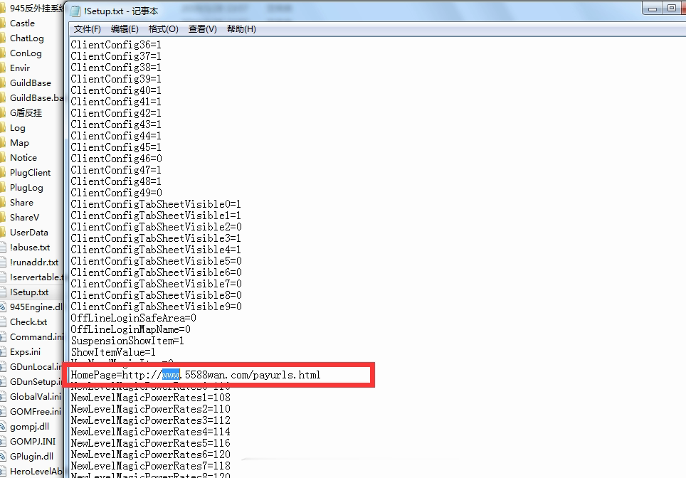 二,打开Mirsrever\Mir200\!Setup.txt,找到一段HomePage的,把后面的链接地址改成你的,如上图所示HomePage那一行。其实很简单,只是有些朋友有时候没注意到,希望大家碰到时这个教程能给大家带来帮助。