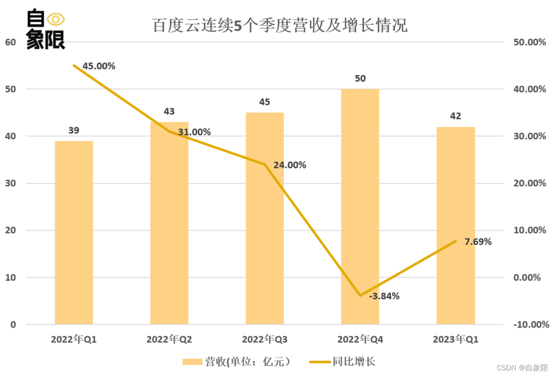 「自象限」对前五个季度,百度智能云官方公众号披露的历季营收数据以及百度集团财报公开数据进行了梳理,然后发现,2022年Q1到2023年Q1,单季营收曾出现微弱涨势,考虑到云厂商Q4统一结算、Q1通常营收较薄的情况,2023Q1出现的负增长并不能说明问题。