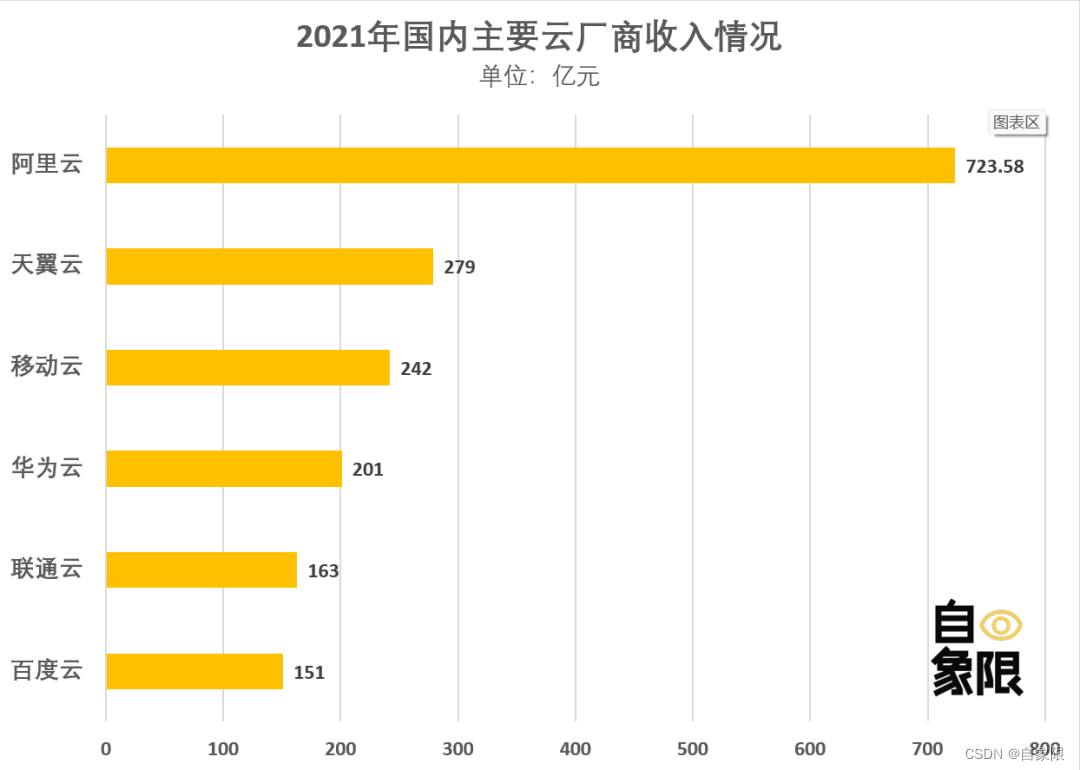 - 2021年,各云厂商营收:阿里云723.58亿元、电信云279亿元、移动云242亿元,华为云201亿元、百度云151亿元、联通云163亿元。